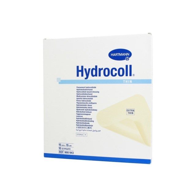 Hydrocoll® Thin är tunna, sterila, självhäftande och absorberande hydrokolloidförband som skapar en fuktig sårmiljö. Förbanden har semipermeabel ovansida av polyuretanfilm vilken är ogenomtränglig för vätska och bakterier. Hydrokolloidförbanden verkar genom att de hydrokolloidala partiklarna, när de kommer i kontakt med exsudat, sväller och bildar en gel som fyller sårhålan och säkerställer fuktig sårmiljö för att stimulera granulation och epitelisering. Hydrocoll® Thin stöder epitelens, celldelning och cellvandring och används med fördel vid epiteliseringsfas. Steril. Mått: 15 cm x 15 cm. Klassificering: Medicinteknisk Produkt, Klass IIb, Steril. Enstycksförpackad.